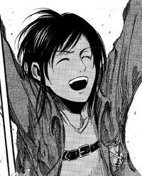 After Mikasa kills Eren, her apparition appears before Jean and Connie, beaming towards her two friends.[100]